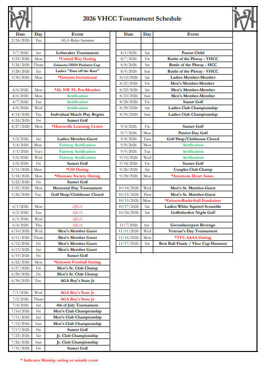 Currently, VHCC has 2 Junior PGA teams and is intended to introduce players to competition. PGA Junior League Golf is the "Little League" approach to golf, where every youngster gets the chance to play. Designed to better socialize the game of golf for juniors 13 and under, PGA Junior League Golf features a team versus team format in a structured league that provides for a more popular, less stressful competition. The emphasis is on the fun, recreation and sportsmanship of the game for players at any skill level. Parents assist by walking with the younger children and helping to teach them the etiquette that is so much a part of the game.